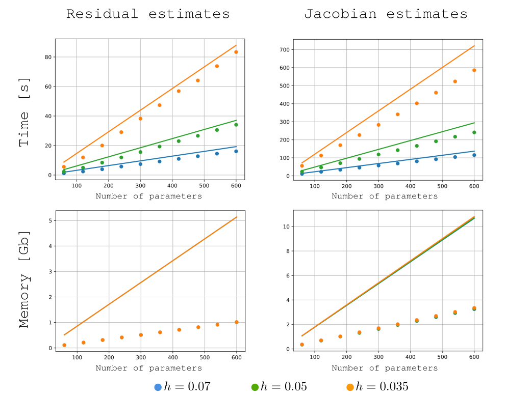 Figure 2: Wall time and memory usage for residual and Jacobian assembly in GridapROMs.jl evaluated on a steady, parameterized Navier–Stokes problem in a 3D geometry, across different mesh resolutions. These measurements are benchmarked against a baseline estimate (solid lines), defined as the cost of assembling a single residual or Jacobian, scaled by the number of parameter instances. The results demonstrate that GridapROMs.jl significantly reduces both wall time and, even more notably, memory usage – highlighting the library's efficiency in handling large-scale parameterized problems.
