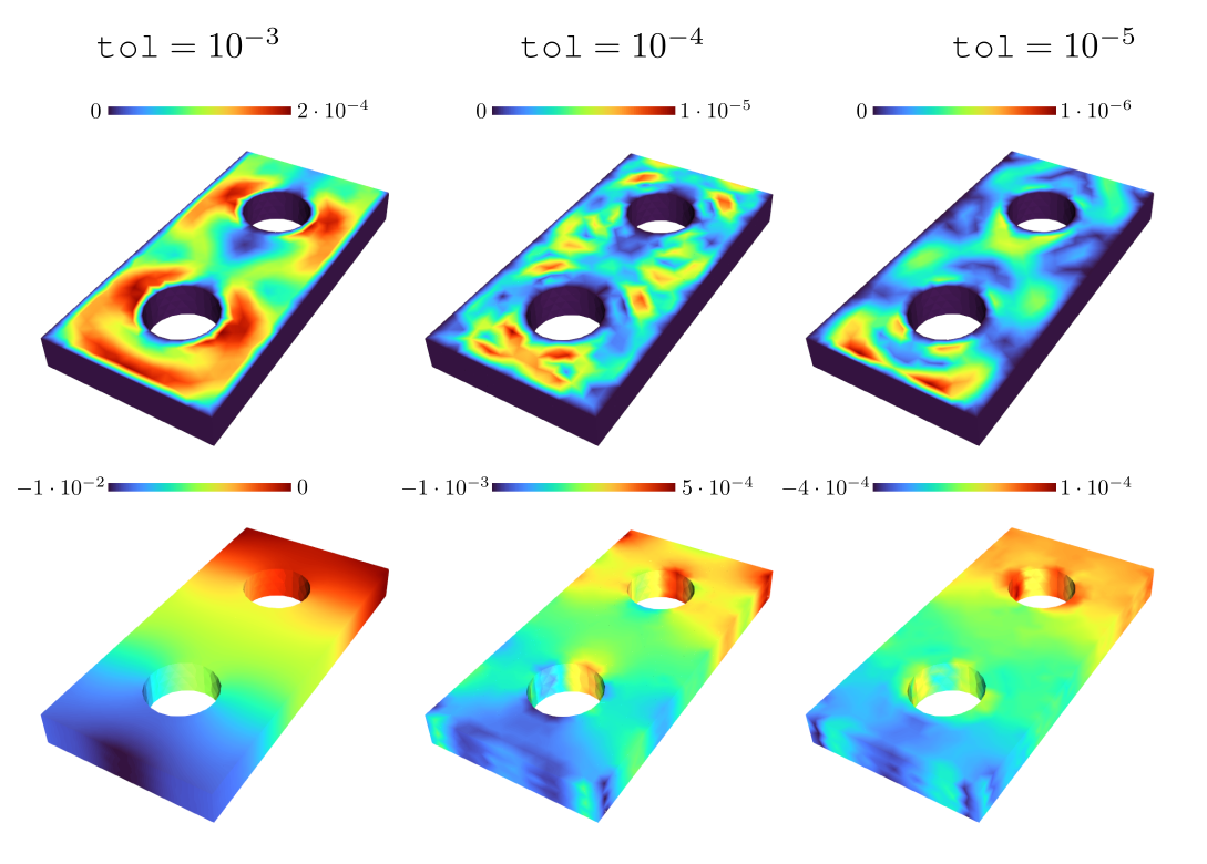Figure 3: Pointwise error between the finite element solution and the corresponding reduced-order approximations computed with GridapROMs.jl, for a fixed parameter and time instance in an unsteady, parameterized Navier–Stokes problem. The top row displays the velocity magnitude error for varying accuracy tolerances , while the bottom row shows the corresponding pressure field error. These results illustrate the effect of the tolerance parameter on the accuracy of the reduced-order solution.Cutting-edge advancements in reduced basis methods for problems defined on parameterized domains