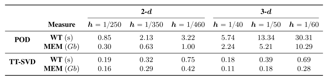Figure 6: From top to bottom: wall time (WT) and memory allocations (MEM) for constructing an -orthogonal basis using both truncated POD and the tensor-train SVD, applied to a Poisson equation. From left to right: results are shown for 2D and 3D geometries across varying mesh sizes , with a fixed accuracy tolerance of . The results highlight the superior computational efficiency of the tensor-train approach in both runtime and memory usage, compared to the traditional POD-based method.Cutting-edge advancements in reduced order models for space-time problems