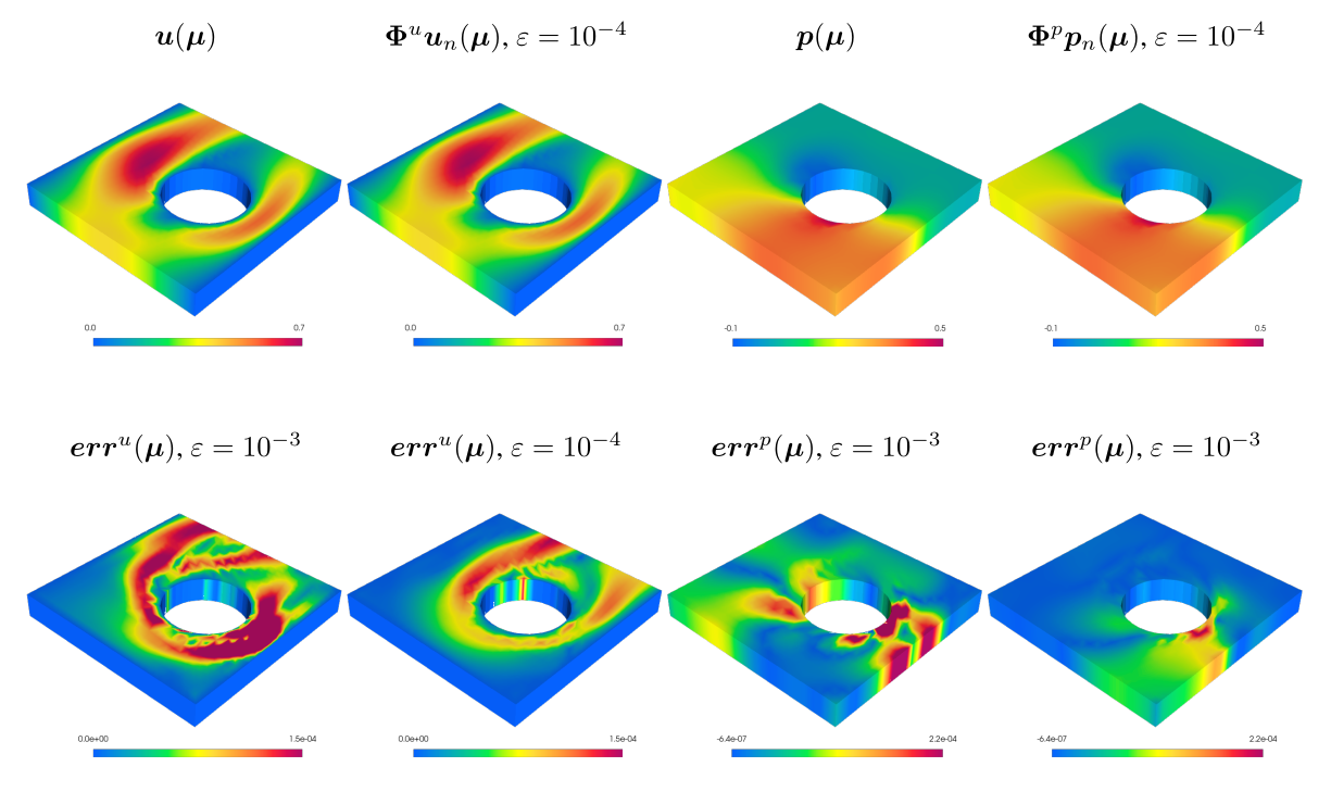 Figure 5: Results for the Navier-Stokes equation benchmark, on a 3D rectangular geometry with a moving cylindrical hole. Top row: finite element velocity magnitude (left), reduced basis velocity magnitude (centre-left), finite element pressure (centre-right), and reduced basis pressure (right); the reduced basis velocity and pressure are obtained with an error tolerance . Bottom row: point-wise velocity error magnitude (left, with a tolerance , and centre-left, with a tolerance ), and point-wise pressure error (centre-right, with a tolerance , and right, with a tolerance ). Value of the test parameter: .The successful integration of tensor-train decompositions with reduced basis methods